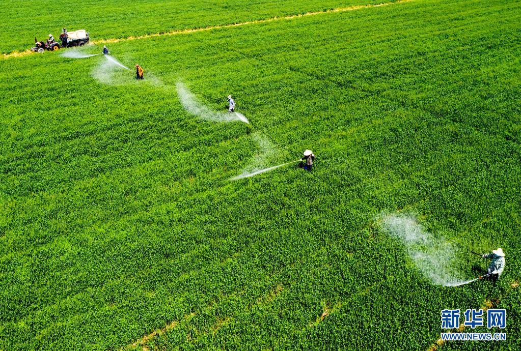 4月6日,安徽省合肥市廬江縣白湖鎮(zhèn)白湖社區(qū),農民在田間進行小麥赤霉病防治作業(yè)。