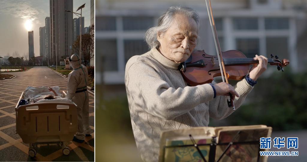 這是一張拼版照片,左圖為:2020年3月5日傍晚,在湖北省武漢大學人民醫(yī)院東院,復旦大學附屬中山醫(yī)院支援湖北醫(yī)療隊醫(yī)生在護送患者王欣做CT的途中停下,讓住院近一個月的老人欣賞久違的日落(甘俊超 攝);右圖為:3月24日,“看夕陽的老人”王欣在東西湖區(qū)園藝花城小區(qū)內(nèi)拉小提琴(新華社記者熊琦攝)。新華社發(fā)