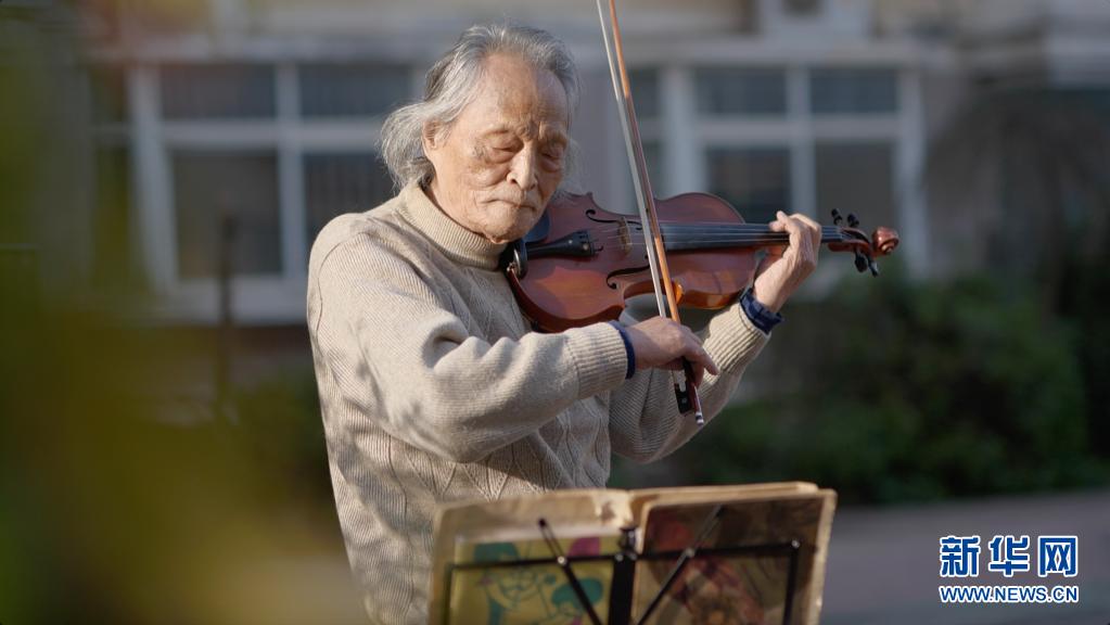 3月24日,“看夕陽的老人”王欣在東西湖區(qū)園藝花城小區(qū)內(nèi)拉小提琴。新華社記者 熊琦 攝