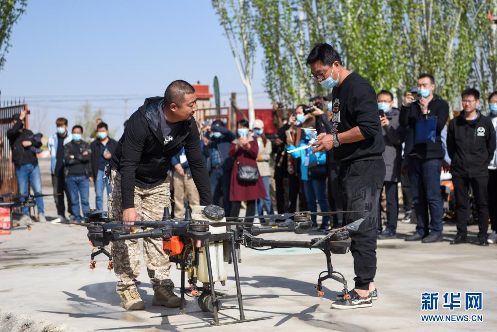 4月11日,在鐵門關市一處香梨示范園,技術人員調試植保無人機。新華社記者 丁磊 攝