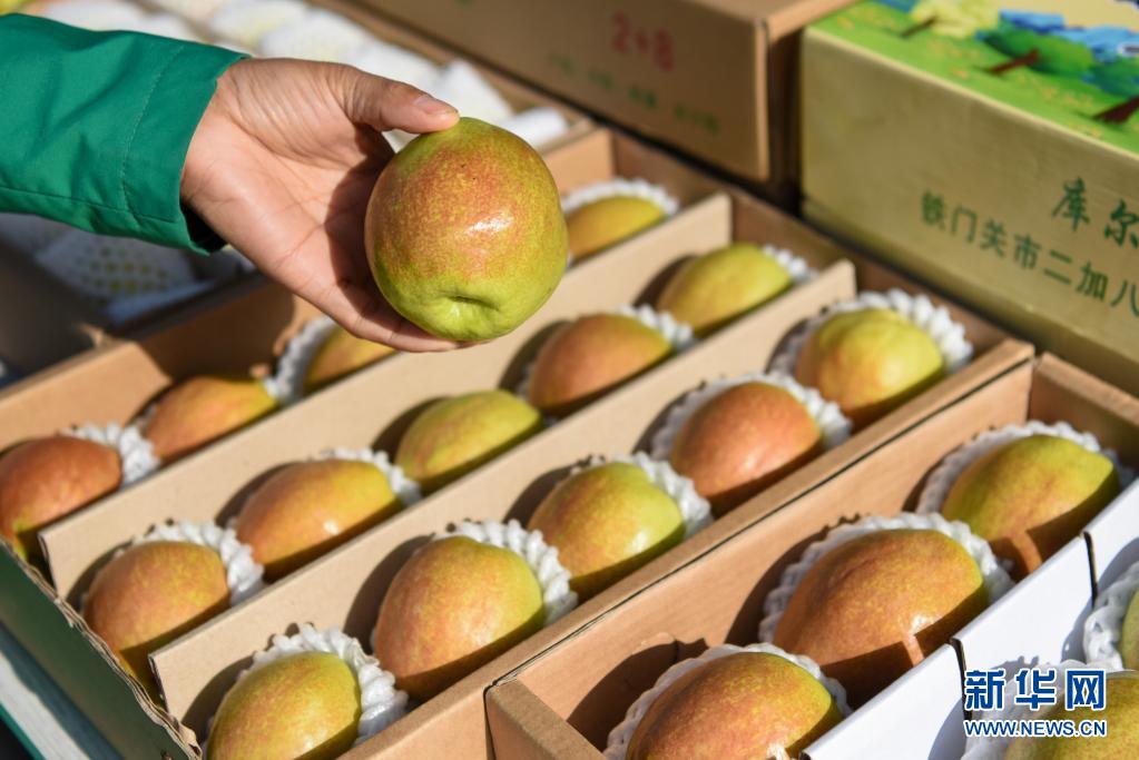 4月11日,在鐵門(mén)關(guān)市一處香梨示范園,果農(nóng)展示庫(kù)爾勒香梨。新華社記者 丁磊 攝