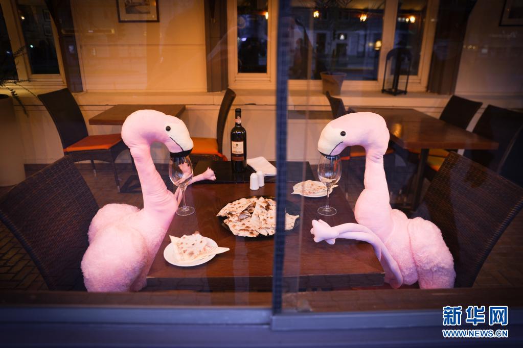 4月13日,波蘭首都華沙一家餐館將動物玩偶擺放在靠窗座位上吸引顧客。