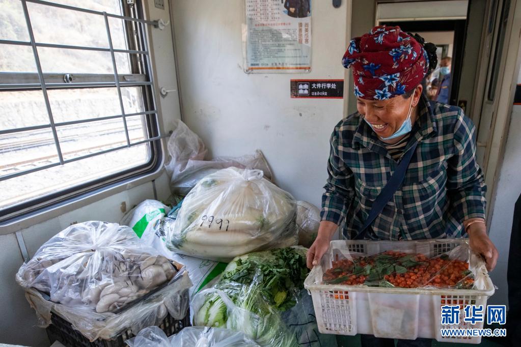 一名彝族商販端著新鮮櫻桃走上5634次列車(chē),她要把這些櫻桃拿去外地售賣(mài)(4月12日攝)。新華社記者 沈伯韓 攝