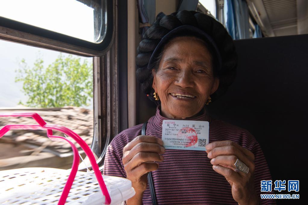在5634次列車上,越西縣村民爾古阿吉木展示車票(4月12日攝)。新華社記者 胥冰潔 攝