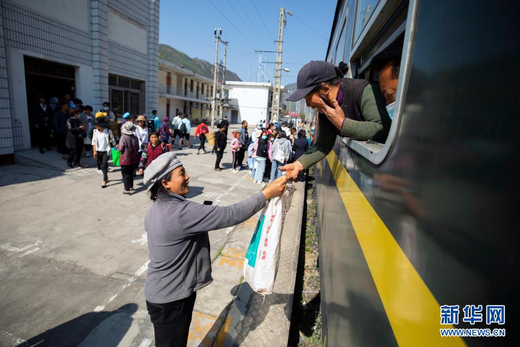 5633次列車??啃≌?,彝族乘客與等候在月臺上的小商販通過車窗交易(4月11日攝)。新華社記者 沈伯韓 攝
