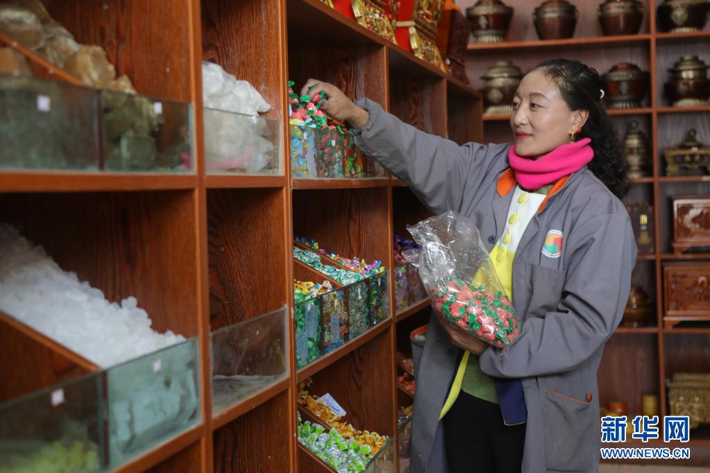 在青海省玉樹(shù)藏族自治州玉樹(shù)市甘達(dá)村利眾專業(yè)綜合合作社,超市售貨員才仁卓尕在整理貨架商品(4月10日攝)。