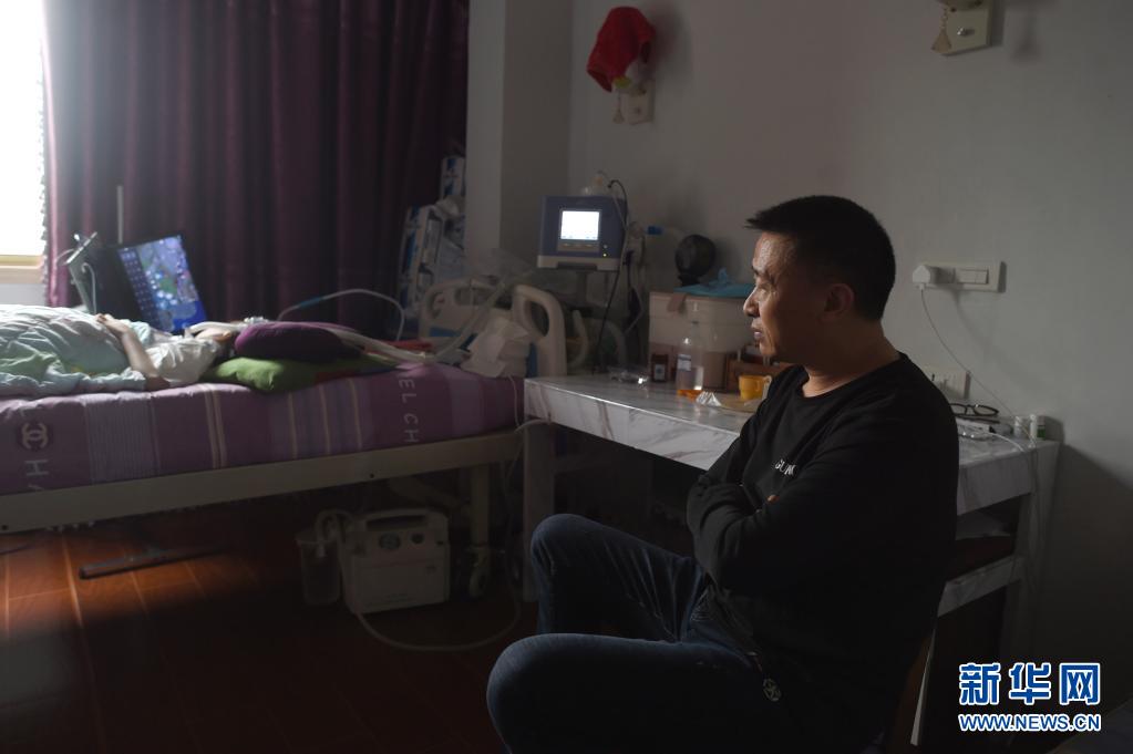 父親包宗鋒坐在床邊隨時(shí)“待命”(4月13日攝)。包宗鋒被檢查出腦血管畸形,因?yàn)橐湛春⒆?,一直不敢去做手術(shù)。