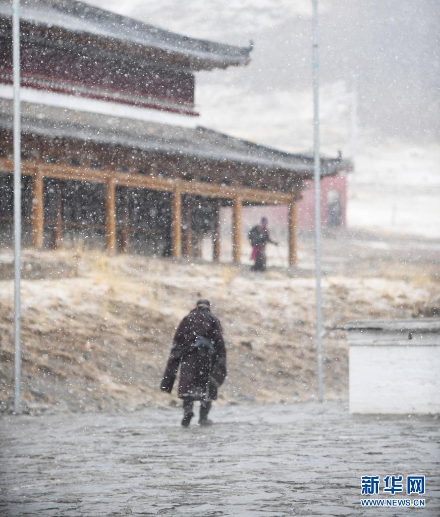 這是4月19日在青海省果洛藏族自治州甘德縣拍攝的雪中行走的村民。新華社記者 張曼怡 攝