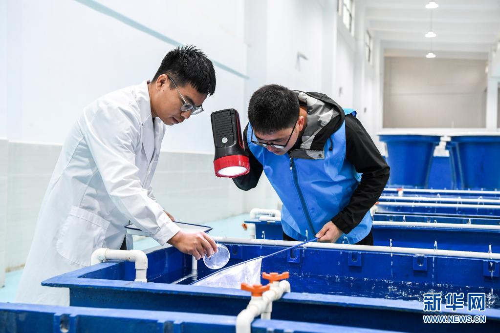 4月20日,大藤峽魚(yú)類(lèi)增殖放流站的工作人員在魚(yú)苗孵化槽內(nèi)采樣。