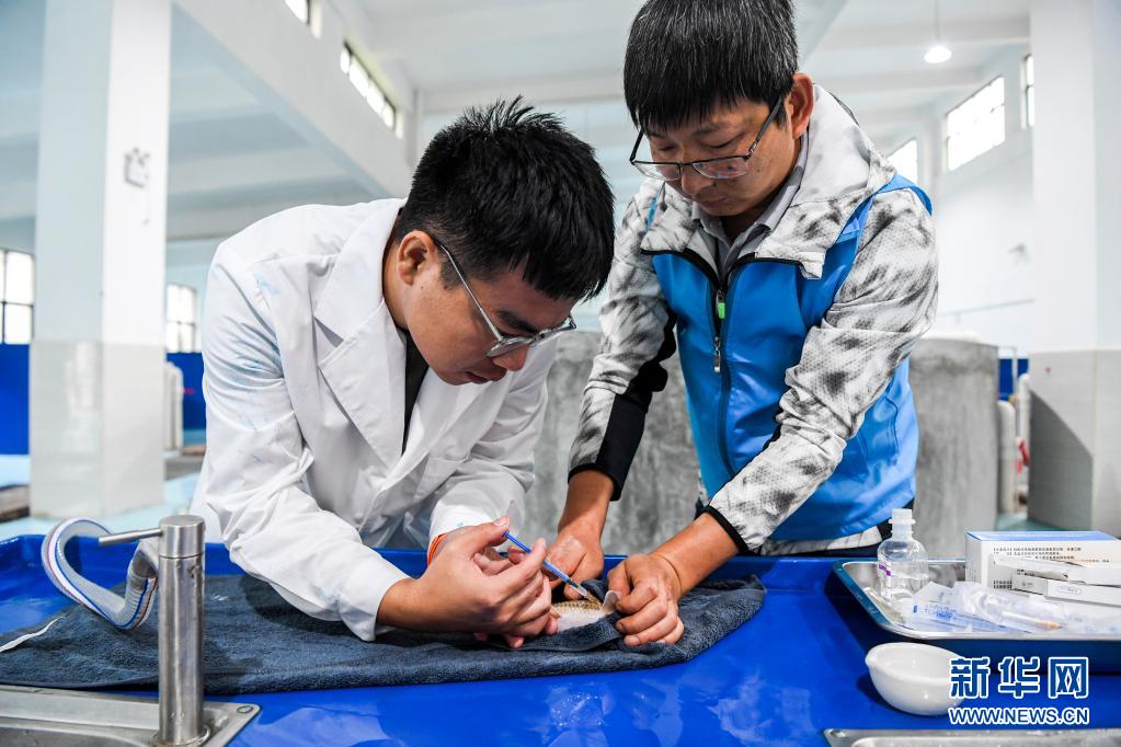 4月20日,大藤峽魚類增殖放流站的工作人員給符合繁育條件的魚苗打催產(chǎn)針。