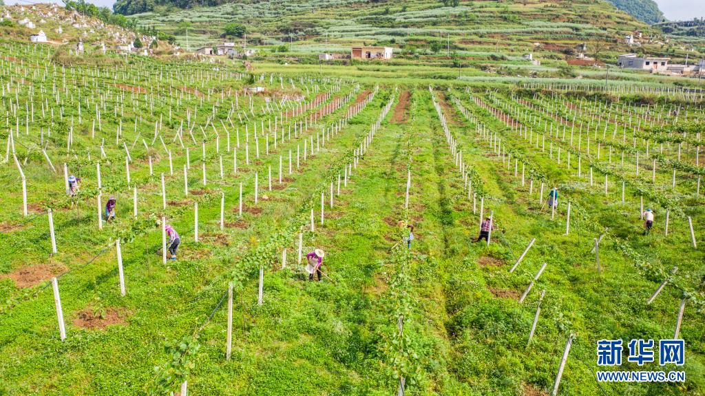 4月20日,貴州省六盤水市六枝特區(qū)木崗鎮(zhèn)農(nóng)民在田地里勞作(無人機照片)。