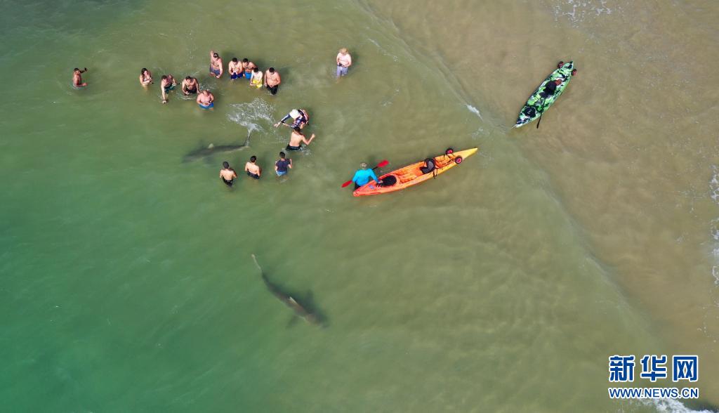 4月20日,在以色列北部城市哈代拉的海邊,鯊魚從人們身邊游過(無人機(jī)照片)。