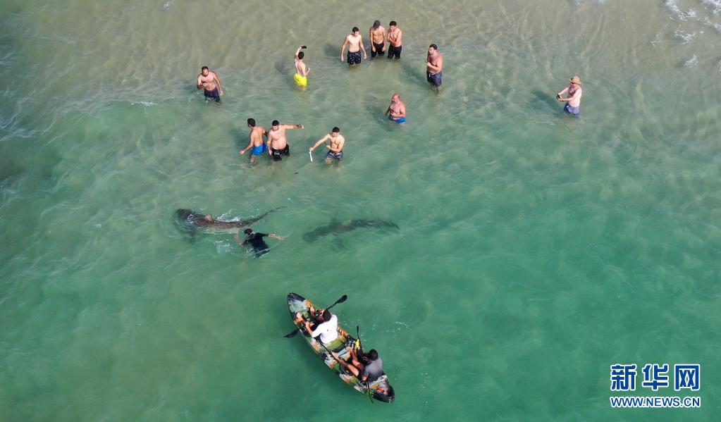 4月20日,在以色列北部城市哈代拉的海邊,鯊魚從人們身邊游過(無人機(jī)照片)。
