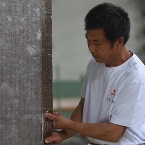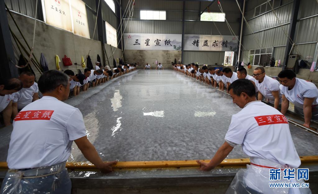 近日,在宣紙產(chǎn)地安徽省宣城市涇縣,“四丈宣紙”的抄制在一家紙業(yè)有限公司啟動。50余名撈紙師傅操作巨型紙簾,齊心協(xié)力,在紙槽旁進行撈紙作業(yè)。來回起落兩次,動作整齊劃一。隨后工人們將紙簾吊起放至一邊揭下,一張巨大的宣紙便撈制成功。經(jīng)過曬、剪等工序后, 制成長13.2米、寬3.6米的巨型宣紙就是“四丈宣紙”。