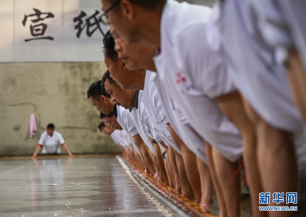 近日,在宣紙產(chǎn)地安徽省宣城市涇縣,“四丈宣紙”的抄制在一家紙業(yè)有限公司啟動(dòng)。50余名撈紙師傅操作巨型紙簾,齊心協(xié)力,在紙槽旁進(jìn)行撈紙作業(yè)。來回起落兩次,動(dòng)作整齊劃一。隨后工人們將紙簾吊起放至一邊揭下,一張巨大的宣紙便撈制成功。經(jīng)過曬、剪等工序后, 制成長(zhǎng)13.2米、寬3.6米的巨型宣紙就是“四丈宣紙”。
