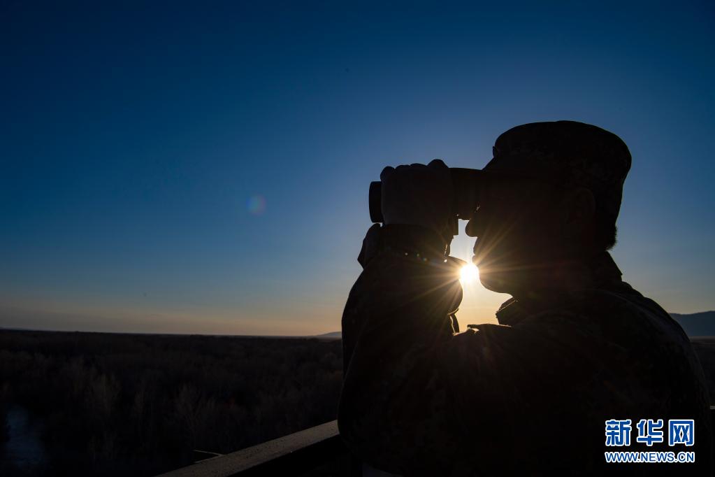 新疆生產(chǎn)建設(shè)兵團(tuán)第10師185團(tuán)職工馬軍武在瞭望塔上觀察管護(hù)轄區(qū)(4月9日攝)。