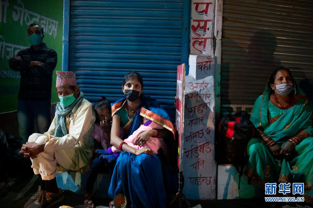4月28日晚,人們在尼泊爾首都加德滿都的路邊等車,準(zhǔn)備在封禁措施實施前離開加德滿都返回家鄉(xiāng)。