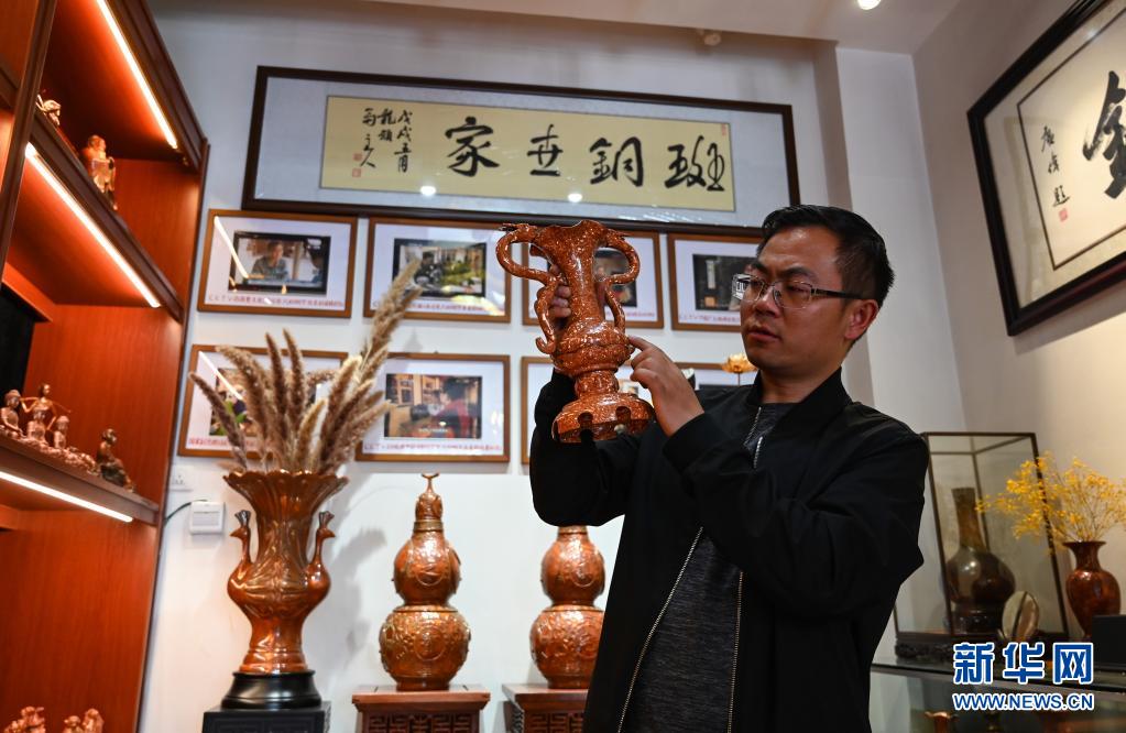 地處滇東北、烏蒙山腹地的云南會澤縣流傳著具有300多年歷史的斑銅制作工藝。斑銅工藝復(fù)雜,要采用高品位的銅為原料,經(jīng)過20余道工序制作而成。產(chǎn)品“妙在有斑,貴在渾厚”,風(fēng)格獨樹一幟。33歲的張偉是會澤“張氏斑銅”的第十三代傳人。自幼深受地域文化和家庭熏陶的他,大學(xué)畢業(yè)后,返鄉(xiāng)從事斑銅制作工作。在會澤古城的“銅匠街”,張偉創(chuàng)辦了斑銅傳習(xí)館,不斷研發(fā)斑銅新產(chǎn)品、傳承著這項非遺技藝?!鞍咩~是一種情感、一種文化,希望在我們這代人的努力下能夠更好地將它傳承下去,讓更多人了解斑銅的獨特魅力?!睆垈フf。