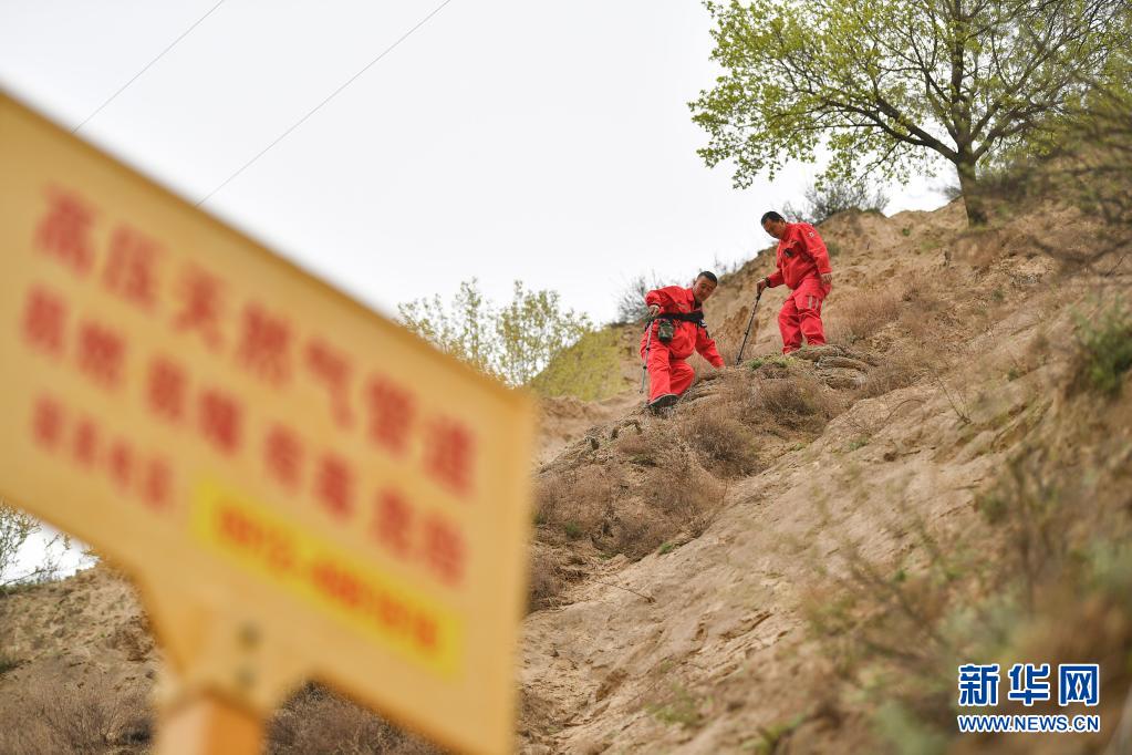 4月27日,巡線隊(duì)員張偉偉(右)、張浩軍在巡線途中。新華社記者 張博文 攝