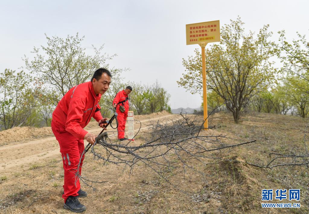 4月27日,巡線隊(duì)員張偉偉(左)在巡線途中清理天然氣運(yùn)輸管線附近的易燃物。新華社記者 張博文 攝