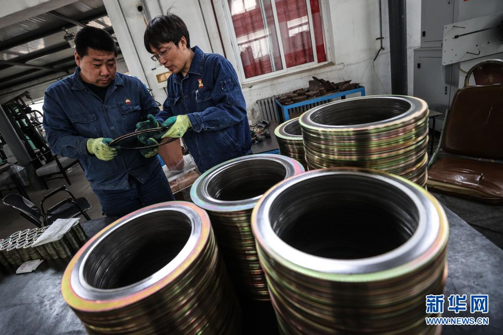 4月30日,王尚典(右)與同事在檢查生產(chǎn)的墊片產(chǎn)品是否合格。