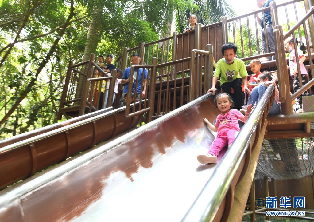 5月1日,孩子們在廣西南寧市青秀山風景區(qū)陸地拓展競技樂園玩耍。