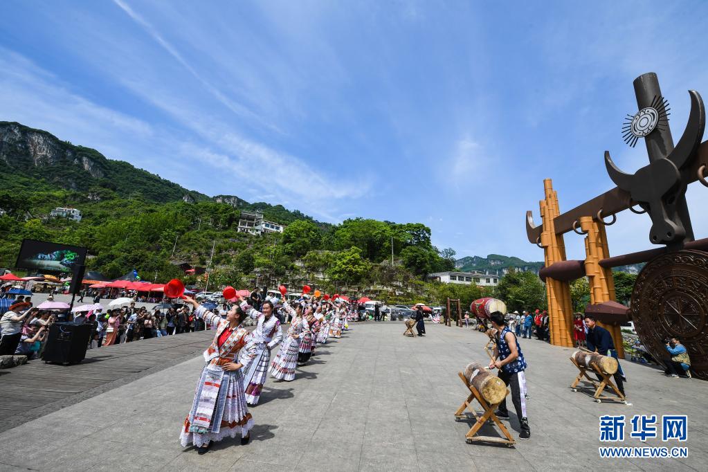 5月1日,在貴州省畢節(jié)市黔西縣新仁苗族鄉(xiāng)化屋景區(qū)文化廣場上,苗族同胞載歌載舞歡度“五一”。