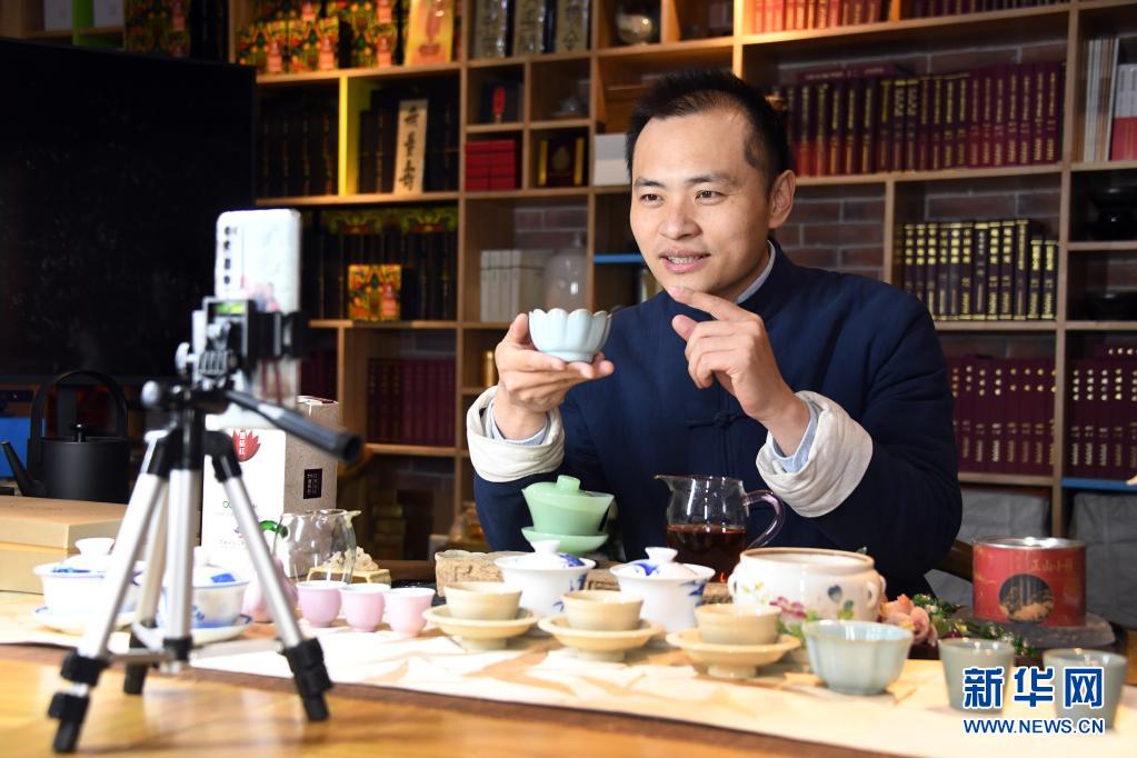 李卓澄在“小茶館”中通過視頻直播的方式向觀眾介紹茶具知識(shí)(4月29日攝)。新華社記者 任超 攝