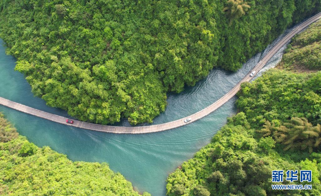 5月2日,游客在湖北省恩施土家族苗族自治州宣恩縣獅子關(guān)景區(qū)水上棧道駕車游玩(無(wú)人機(jī)照片)。新華社發(fā)(王俊 攝)