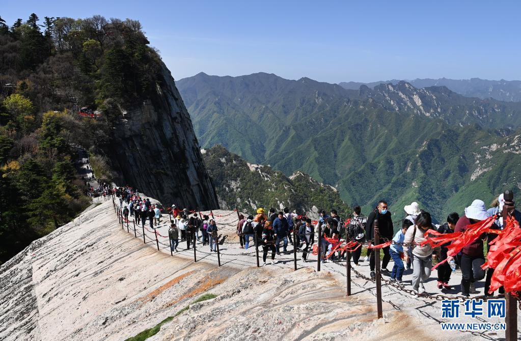 5月5日,游客攀登華山西峰龍脊背。