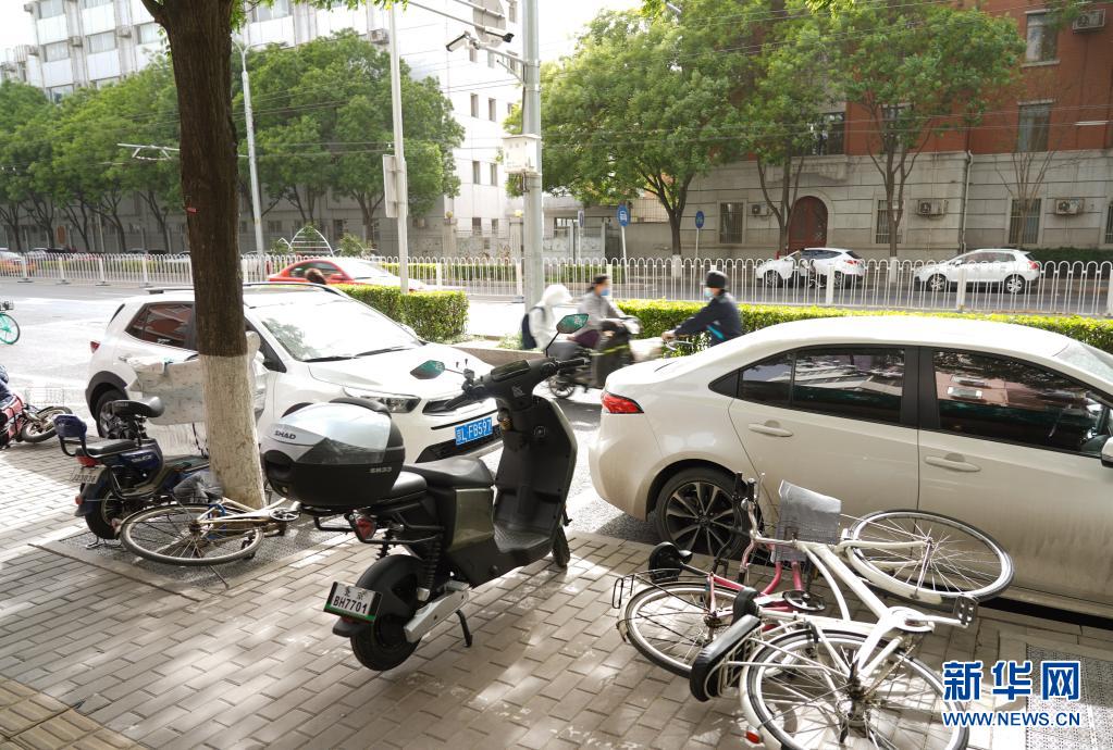 5月6日,在北京市西城區(qū)長椿街,路邊停放的自行車被大風(fēng)吹倒。