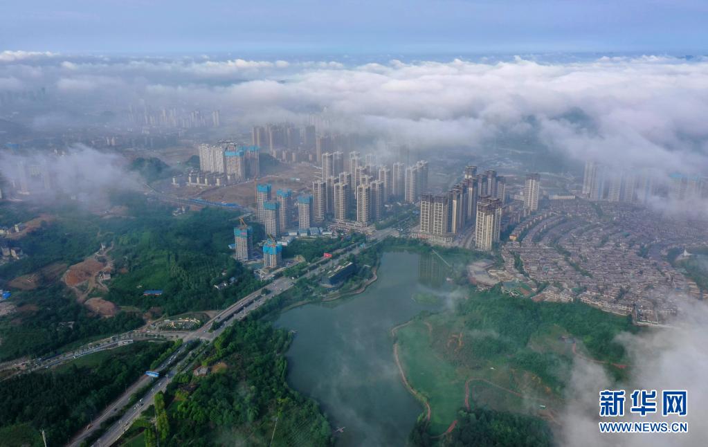 5月8日,貴陽市觀山湖區(qū)的高樓被霧氣籠罩(無人機(jī)照片)。