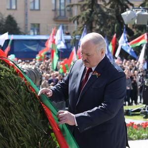 5月9日,白俄羅斯總統(tǒng)盧卡申科在明斯克向勝利紀念碑獻花。