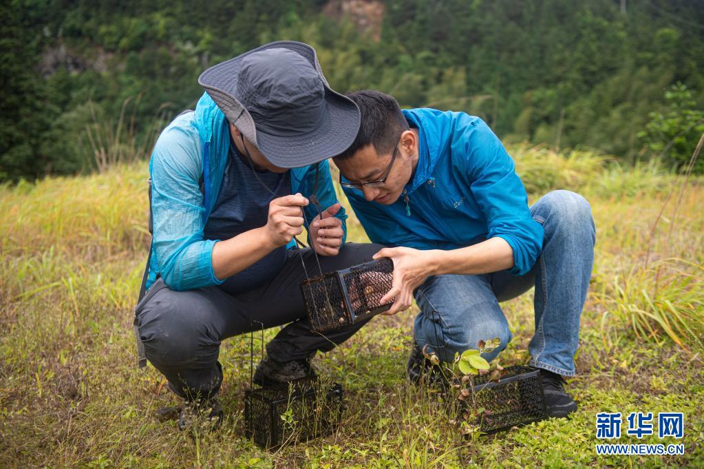 5月12日,南京環(huán)境科學研究所研究員雍凡(左)與參與此次調查的助理劉煜坤觀察誘捕籠內的動物活動痕跡。