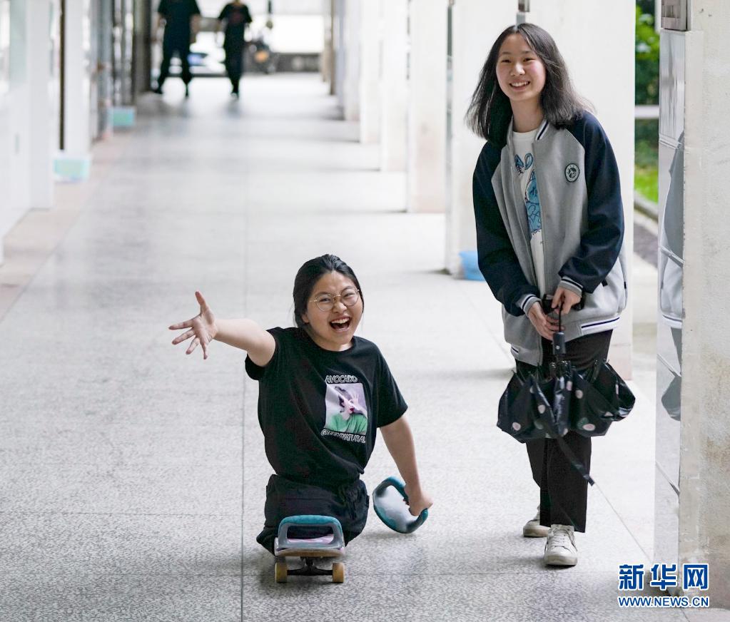 16歲的蔣張子怡是江西上饒中學(xué)高中一年級的學(xué)生。2010年一場車禍奪去了她的雙腿,如今的她只能依靠滑板代步,用雙手前行,為此,大伙都稱她“滑板姑娘”。
