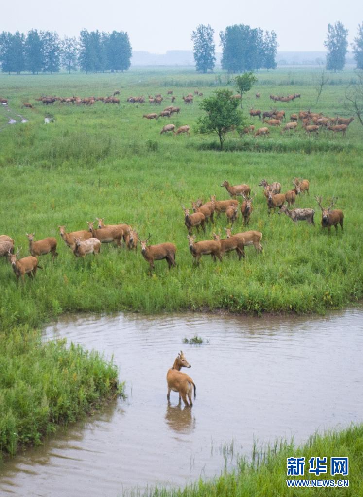 5月17日,一群麋鹿在石首麋鹿國家級自然保護區(qū)內(nèi)活動(無人機照片)。新華社記者 肖藝九 攝