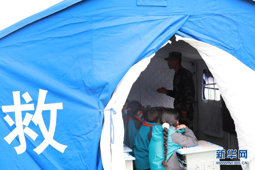 5月24日,武警青??傟牴逯ш牂C動大隊排長張國睿為花石峽鎮(zhèn)藏文中心寄宿制小學的孩子上課。新華社記者 劉芳 攝