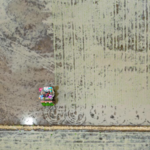 5月27日,在吉林省吉林市永吉縣一拉溪鎮(zhèn)九月豐家庭農(nóng)場(chǎng),農(nóng)民駕駛農(nóng)機(jī)進(jìn)行水稻插秧(無(wú)人機(jī)照片)。