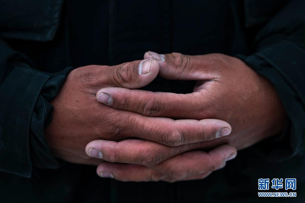 放牧、登山,多年的高原戶外生活在別克米爾扎·圖爾達(dá)力的手上留下風(fēng)霜的印記(5月15日攝)。新華社記者 胡虎虎 攝