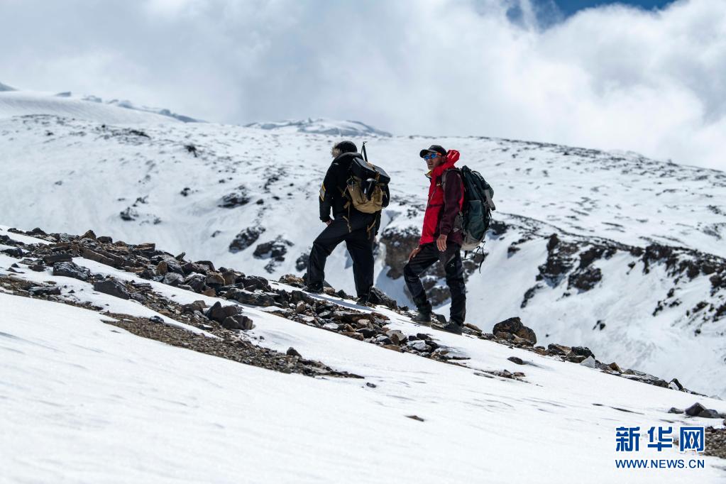 在當(dāng)天的適應(yīng)性訓(xùn)練中,別克米爾扎·圖爾達(dá)力(左)和同伴庫爾班巴依·努爾麥麥提行進(jìn)在慕士塔格峰海拔約5000米的山路上(5月15日攝)。新華社記者 胡虎虎 攝