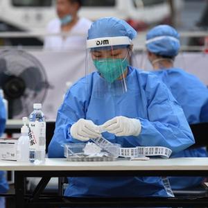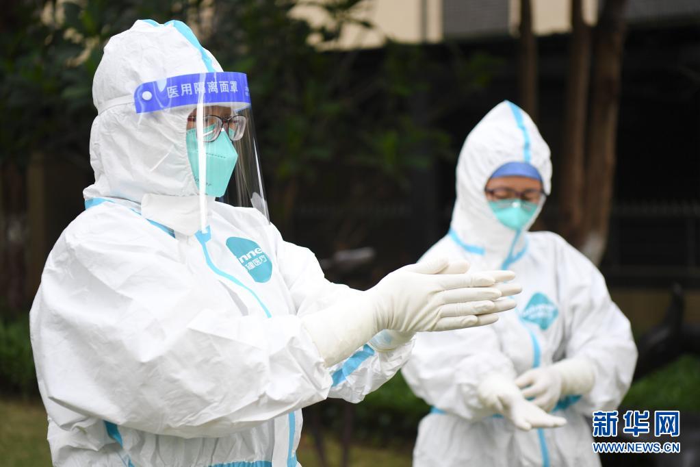 5月27日,在廣州荔灣區(qū)白鶴洞街道一小區(qū)檢測(cè)點(diǎn),荔灣區(qū)骨傷科醫(yī)院的醫(yī)護(hù)人員在開始檢測(cè)前檢查防護(hù)裝備。新華社記者 鄧華 攝