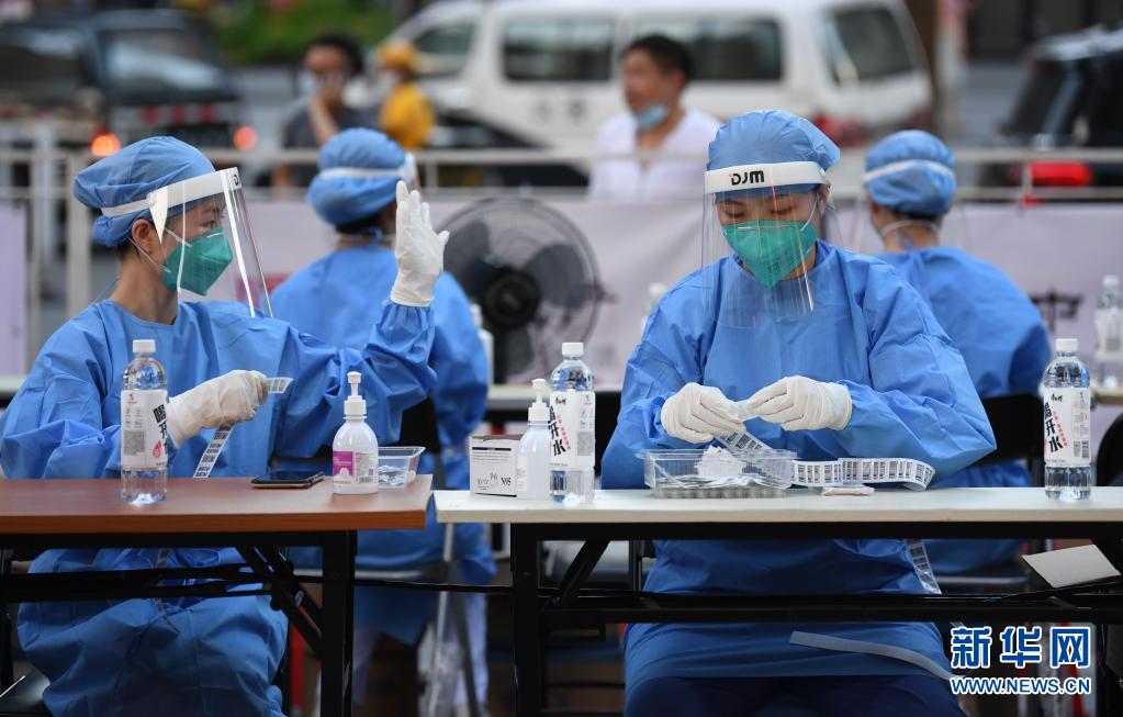 5月27日,在廣州荔灣區(qū)廣鋼新城核酸臨時(shí)采集點(diǎn),南方醫(yī)科大學(xué)南方醫(yī)院的醫(yī)務(wù)人員進(jìn)行檢測前的準(zhǔn)備工作。新華社記者 鄧華 攝