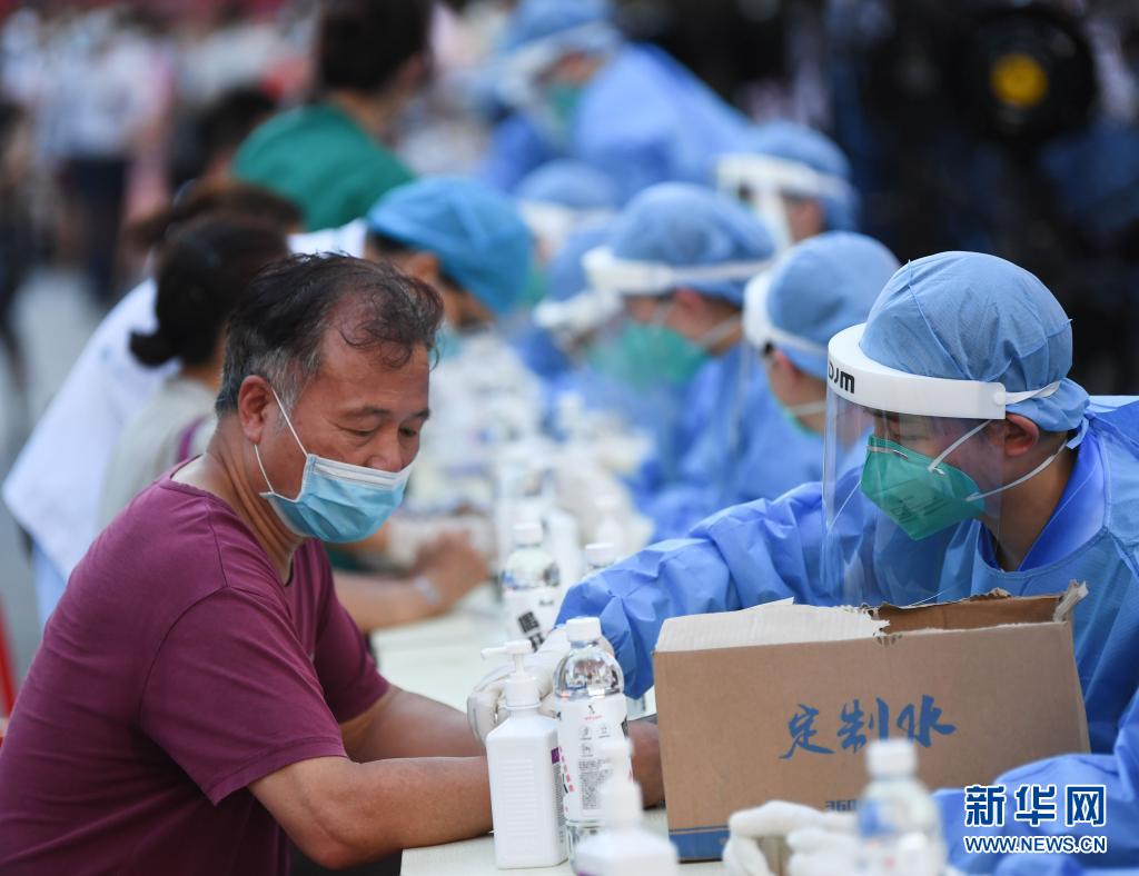 5月27日,在廣州荔灣區(qū)廣鋼新城核酸臨時(shí)采集點(diǎn),南方醫(yī)科大學(xué)南方醫(yī)院的醫(yī)務(wù)人員核對(duì)市民信息。新華社記者 鄧華 攝