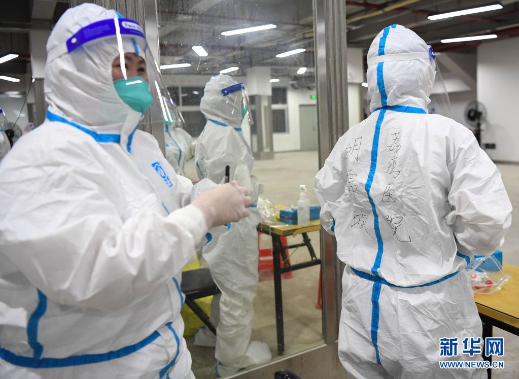 5月26日,在廣州荔灣體育館核酸檢測點(diǎn),荔灣中心醫(yī)院的醫(yī)務(wù)人員在防護(hù)服上寫上個(gè)人信息。新華社記者 鄧華 攝