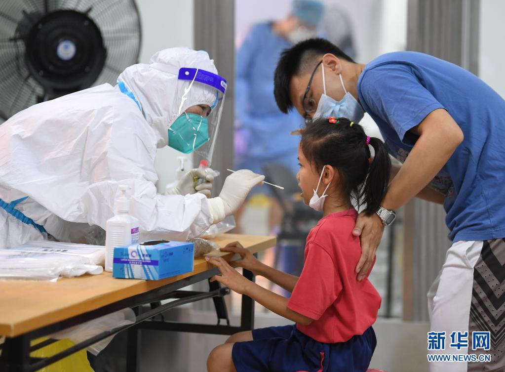 5月26日,在廣州荔灣體育館核酸檢測點,小朋友在家人的陪伴下進行核酸檢測采樣。新華社記者 鄧華 攝