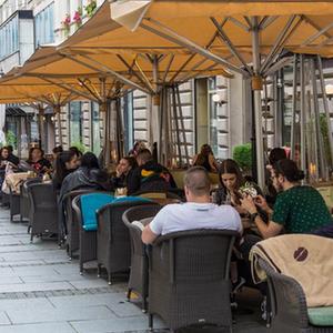 5月31日,在塞爾維亞貝爾格萊德,人們?cè)谝患也蛷d的室外餐區(qū)用餐。