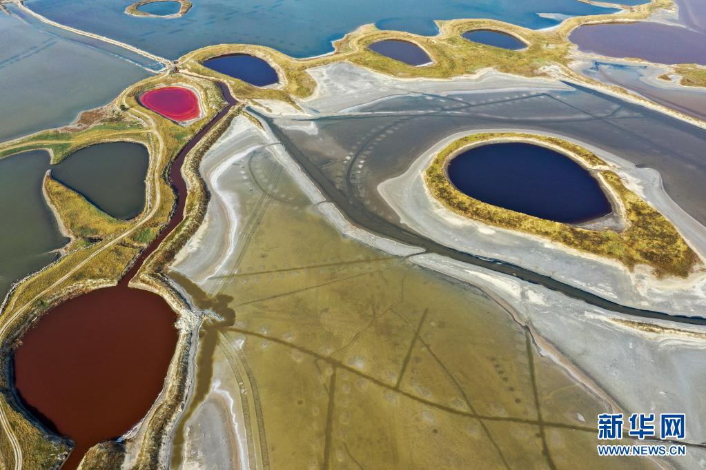 近日,隨著氣溫不斷升高,山西運城鹽湖呈現(xiàn)五彩斑斕的景象。