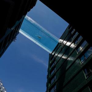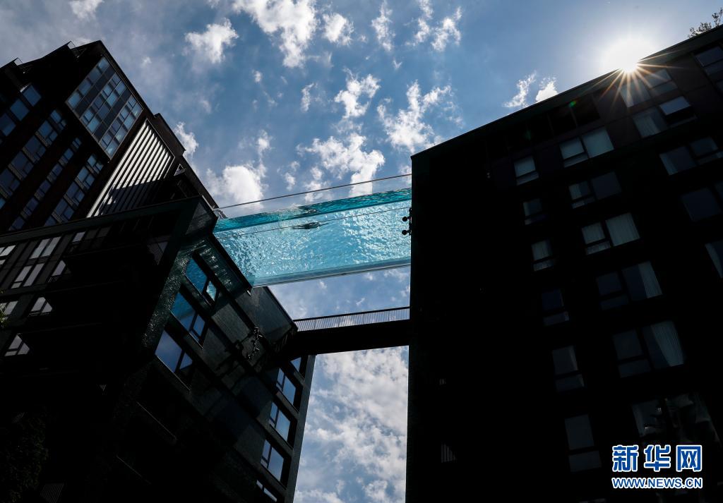 6月2日,一名男子在英國(guó)倫敦南部一個(gè)建造于兩棟公寓樓之間的“空中泳池”游泳。