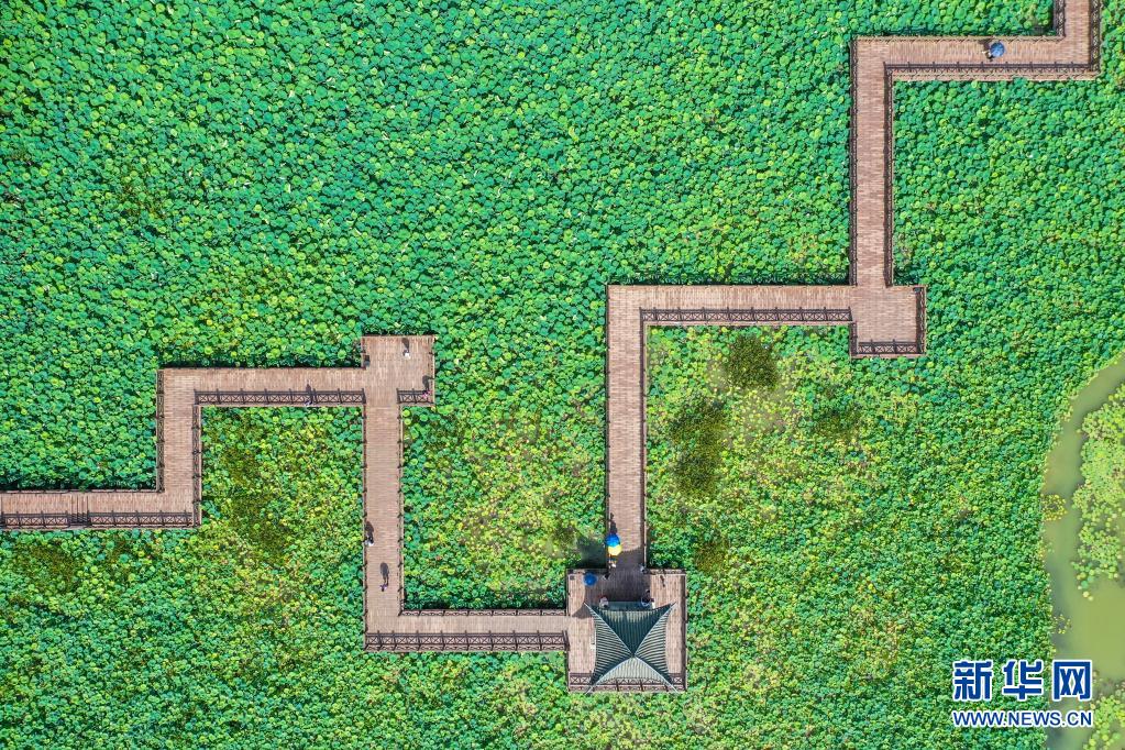 這是南寧市南湖內(nèi)的觀景棧道(6月14日攝,無(wú)人機(jī)照片)。新華社記者 徐海濤 攝