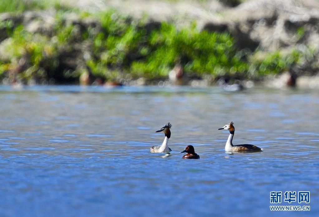 6月14日在拉魯濕地拍攝的兩只鳳頭??和一只小??(中)。夏日里,鳳頭??和小??在西藏拉薩拉魯濕地國家級自然保護區(qū)水面上嬉戲。新華社記者 張汝鋒 攝